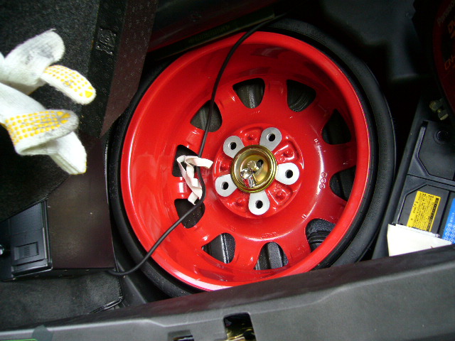 この写真の軍手の下に写っているCDプレイヤーが干渉してテンパータイヤが外せないので、先にCDプレイヤーの固定用のねじをゆるめてどけておく。
